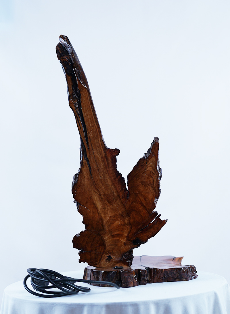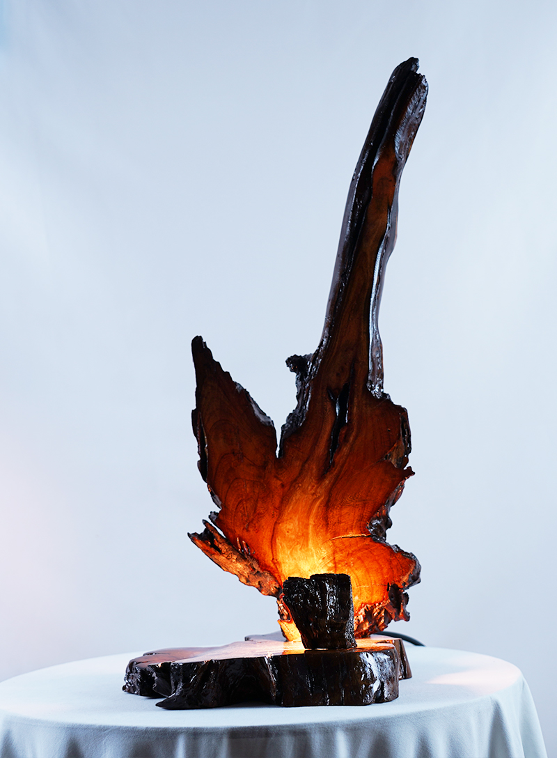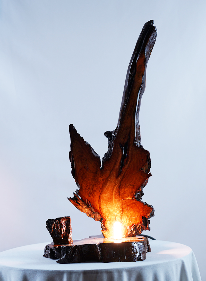 Esta es una lámpara especial, que tanto y tanto he buscado. Un día, en un desmonte del terreno, vi una gran bola roja con un trocito de tocón hacia arriba y una rama hacia un lado. Era de espino albar o majuelo, como lo llaman en Aragón. La terminé de sacar de la tierra y la cogí. Le di muchas vueltas en la mano por que algo me llamaba la atención; sabía que debía estar dentro, pero no lo veía. Me la llevé y, mientras seguía paseando por el boque, algo me decía en mi cabeza que tenía que abrir esa bola de madera.