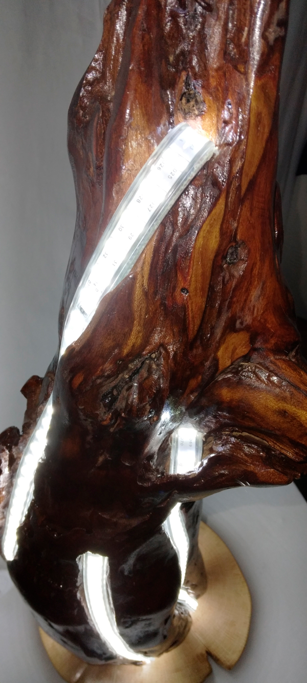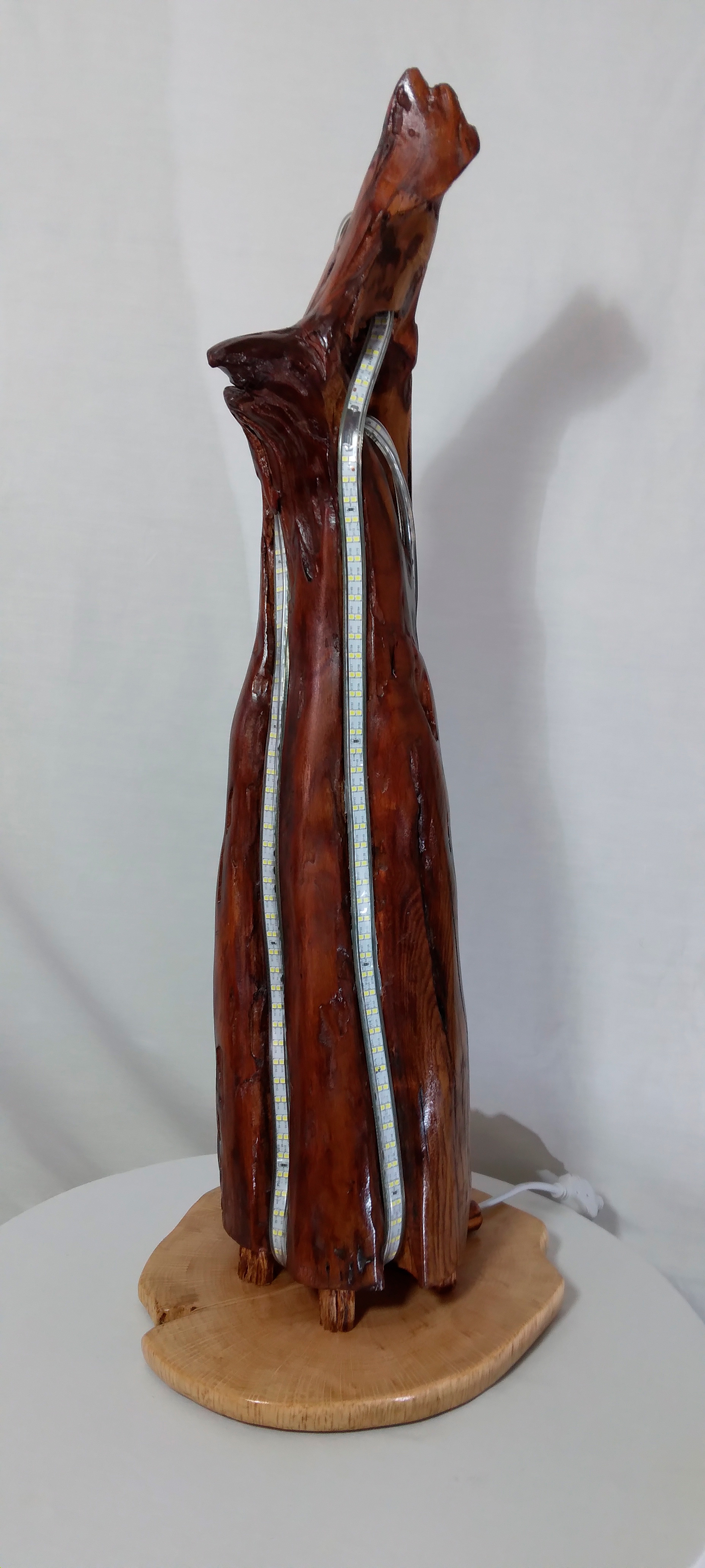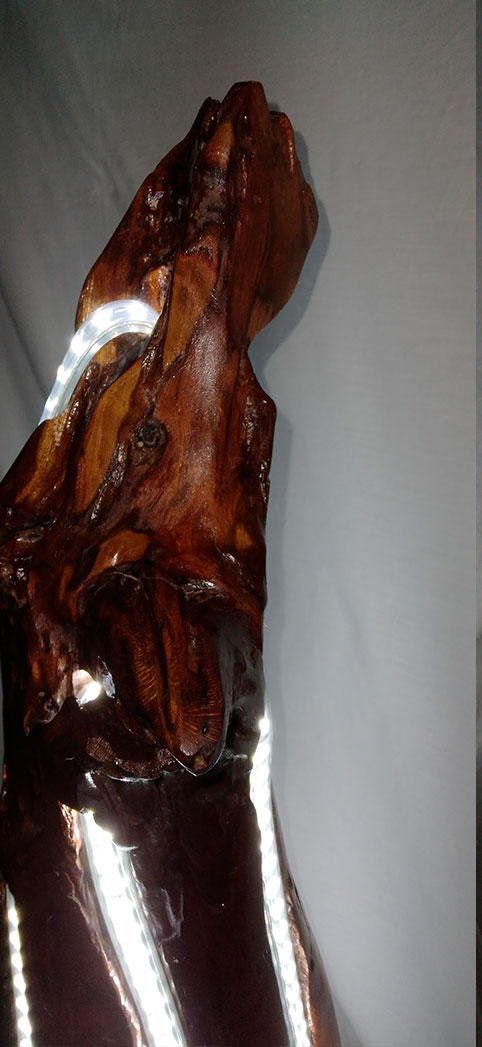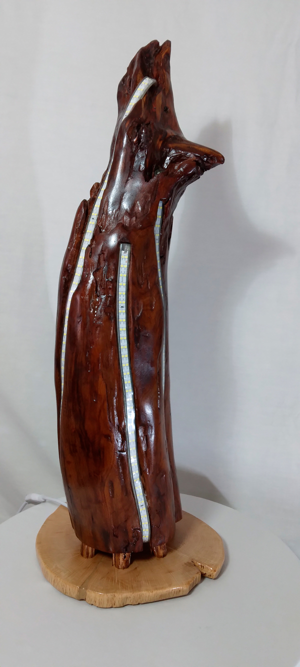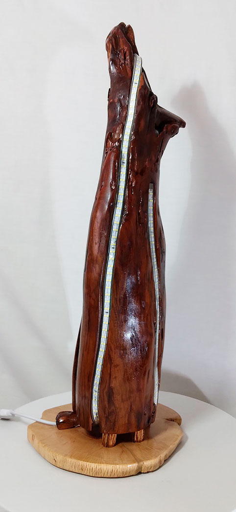 La madera roja de espino albar es una de mis favoritas, como os habéis podido dar cuenta en algunas de mis creaciones. Esta es muy especial, es un tronco de la raíz de majuelo que, combinado con luces LED, parece salido de otro espacio, de otro tiempo: un viajero del universo con la cabeza de algún ser extraño, este es Meteorito. Espero que os guste.