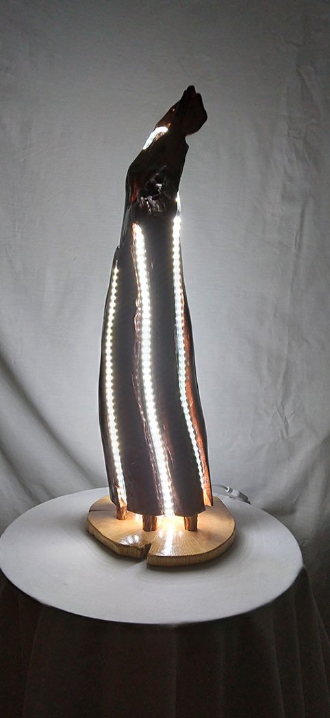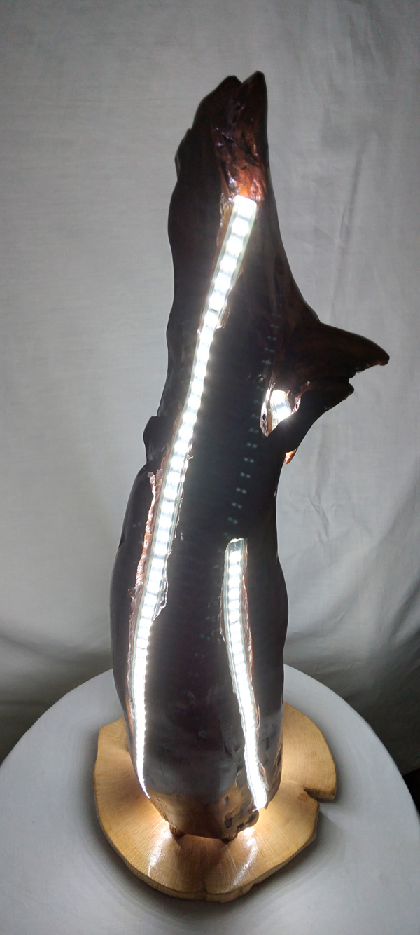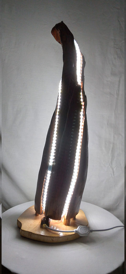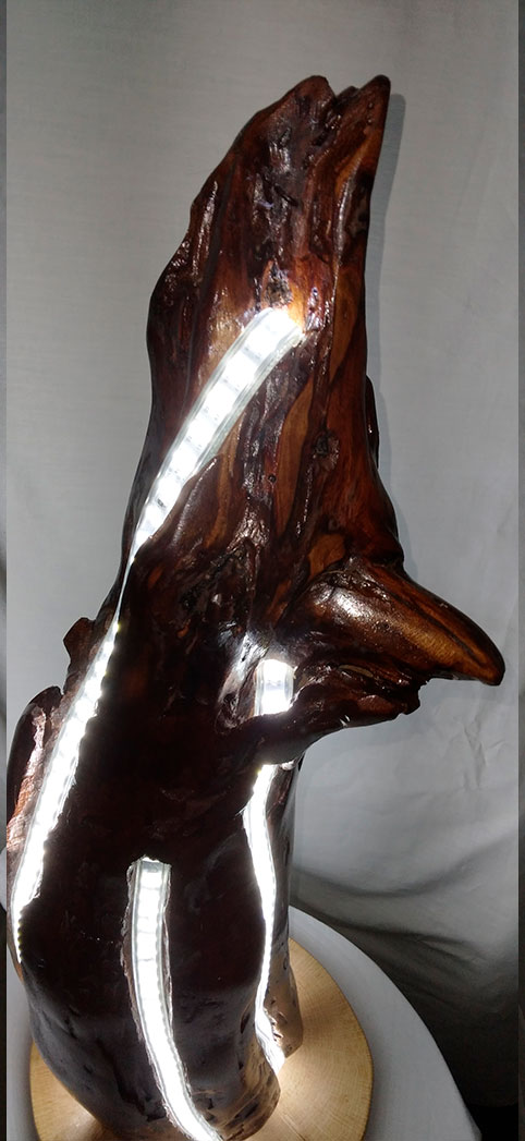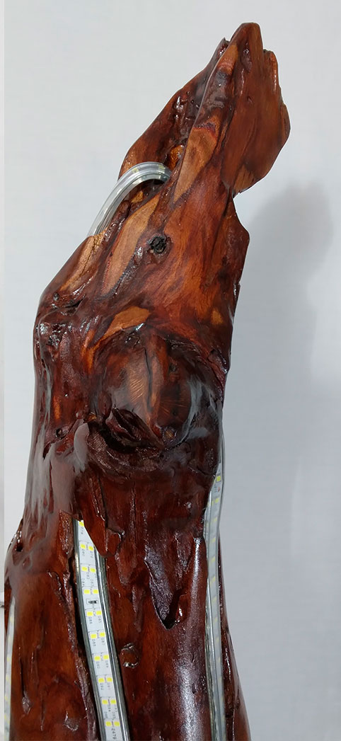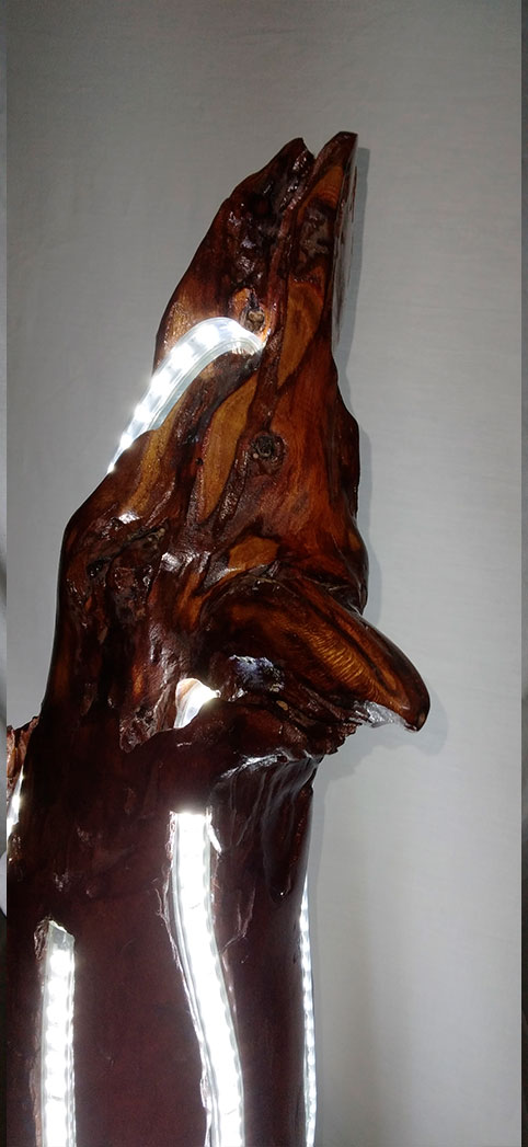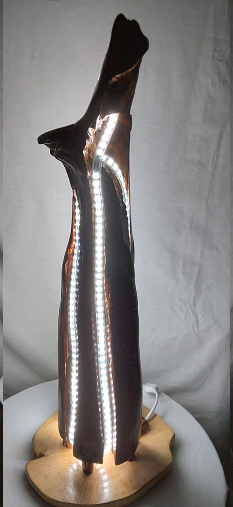 La madera roja de espino albar es una de mis favoritas, como os habéis podido dar cuenta en algunas de mis creaciones. Esta es muy especial, es un tronco de la raíz de majuelo que, combinado con luces LED, parece salido de otro espacio, de otro tiempo: un viajero del universo con la cabeza de algún ser extraño, este es Meteorito. Espero que os guste.