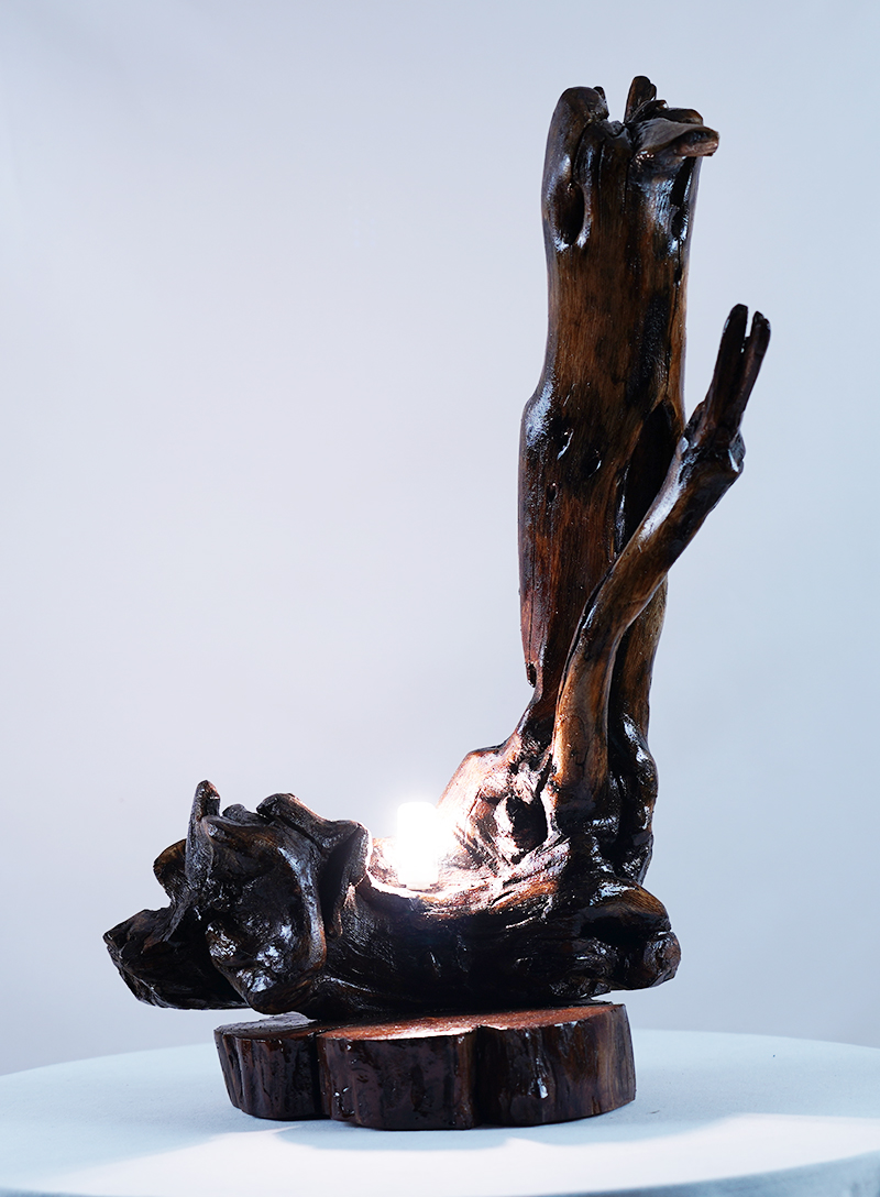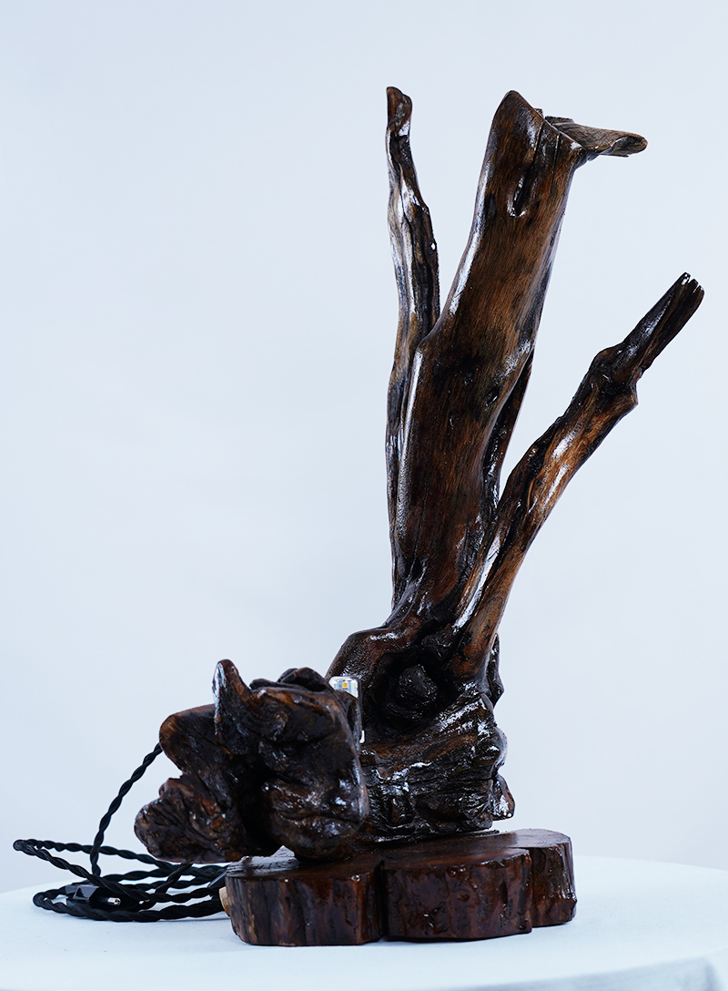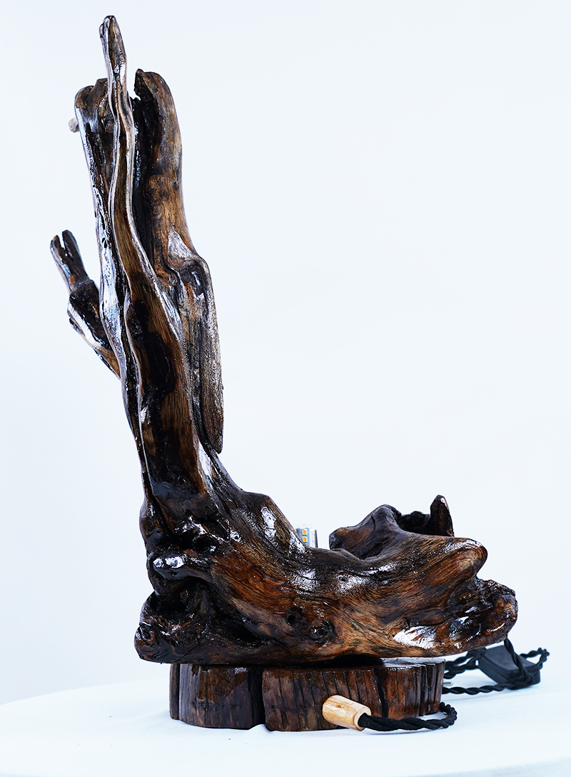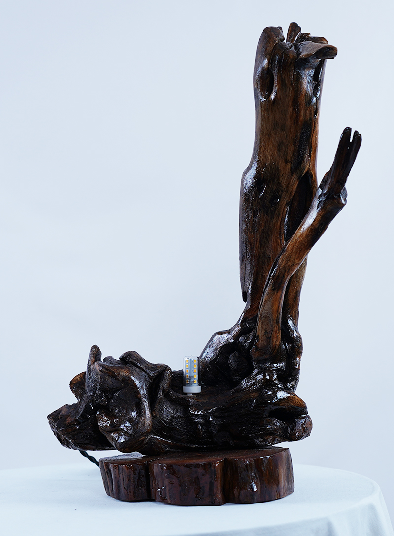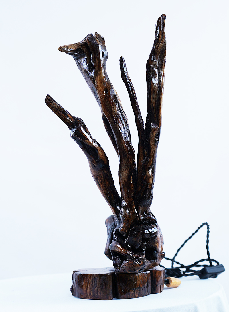 Cuando por fin la saqué, era una raíz fantástica de rosal silvestre y mi querida esposa la miró y simplemente dijo: Neptuno. Se me abrieron los ojos como platos, volví a mirar la pieza y sí, ahí estaba Neptuno, pero también estaba su tridente, su corona, el Nautilus, la espada que corta el mar. Esta lámpara es todo un homenaje al dios del mar.